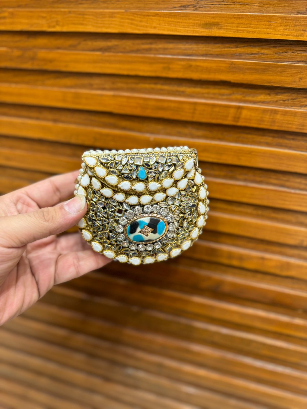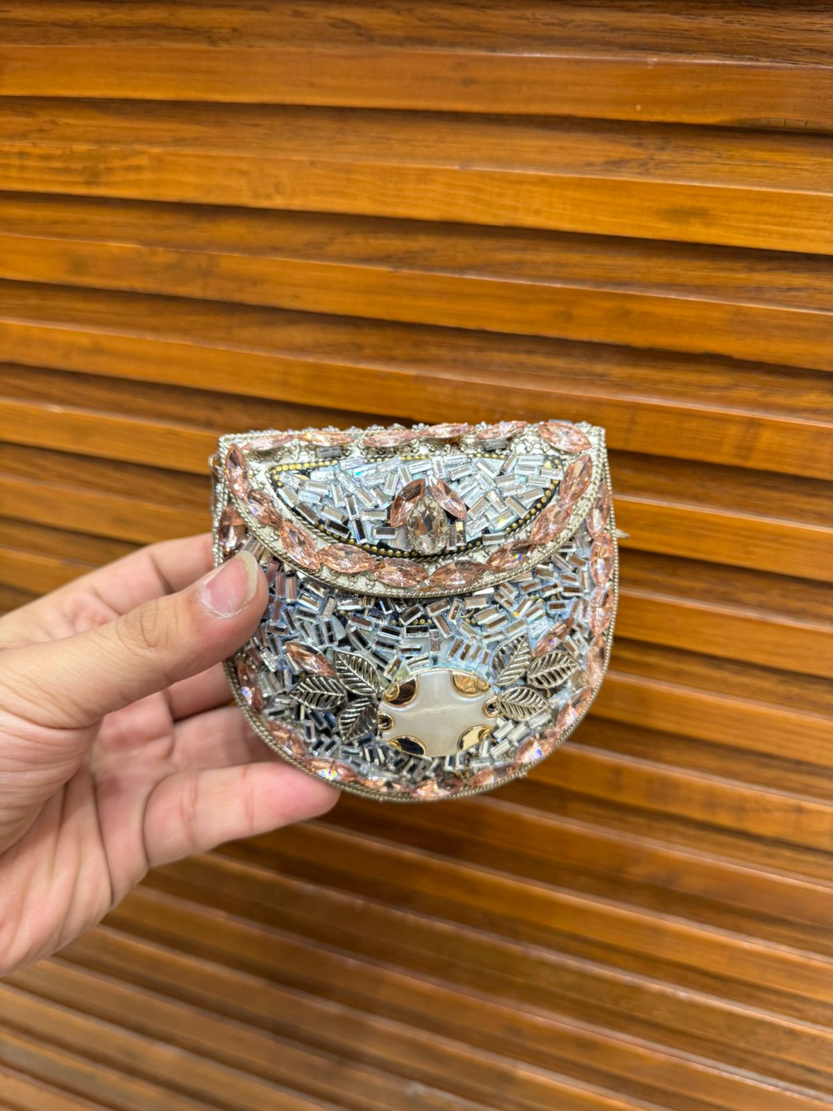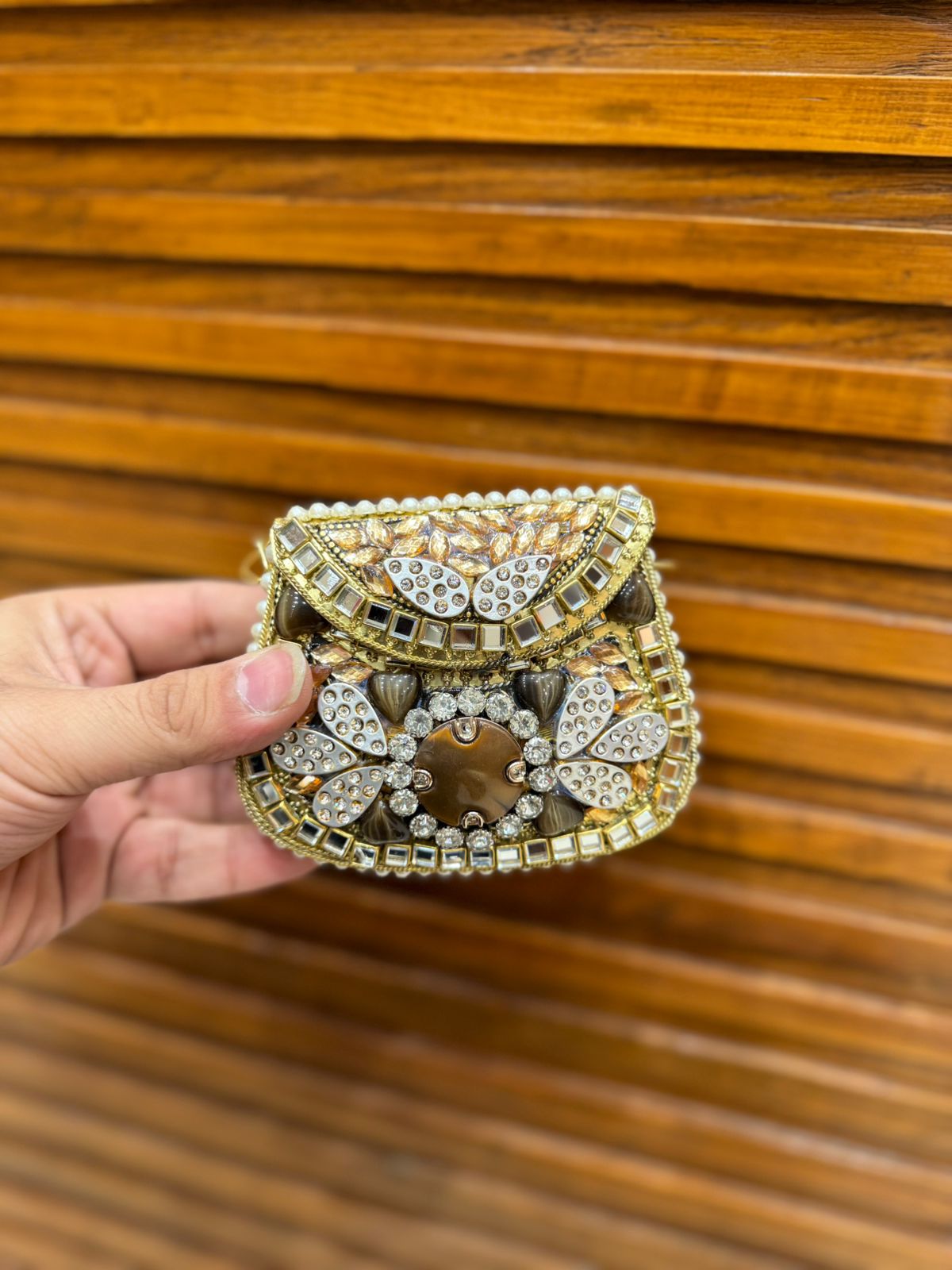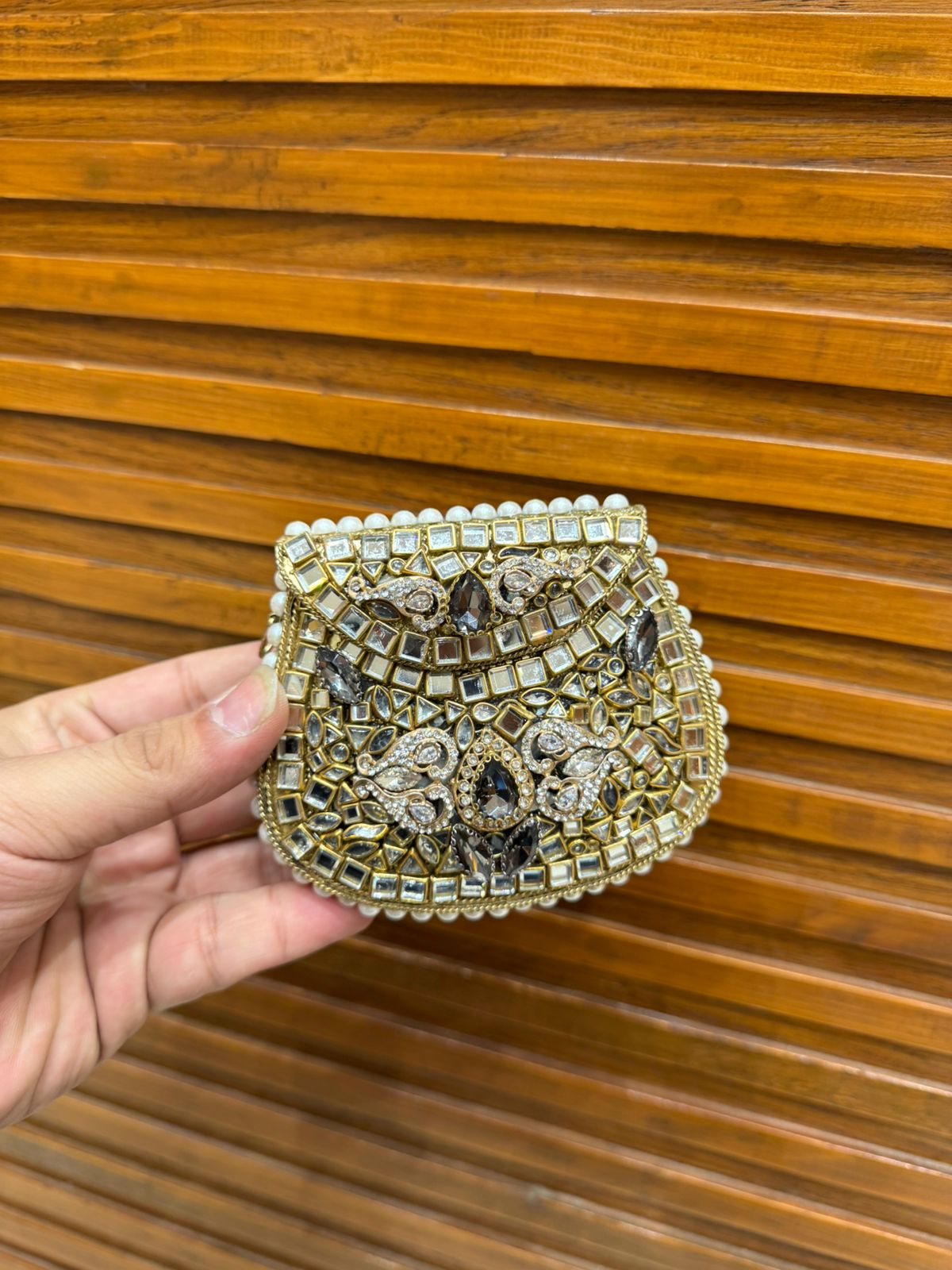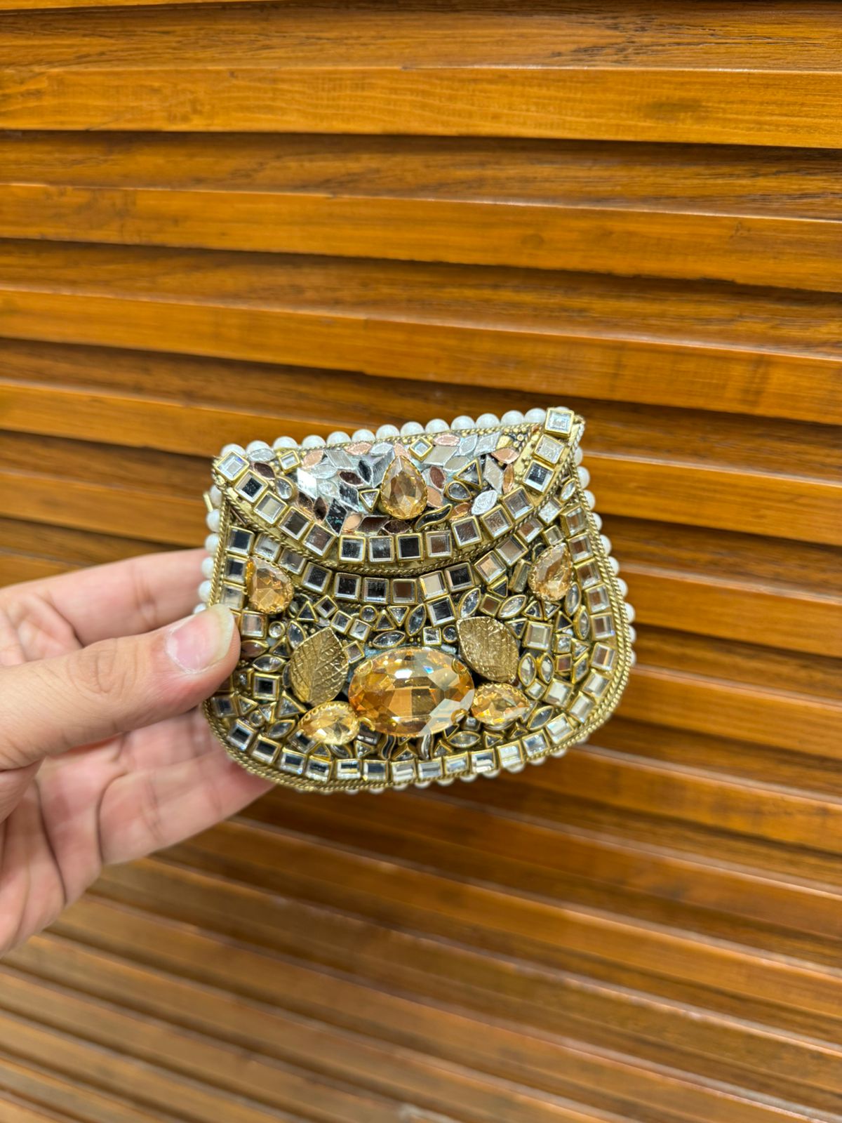 Handmade Afghani clutch featuring exquisite craftsmanship and a structured design. Adds a unique ethnic touch to any outfit.